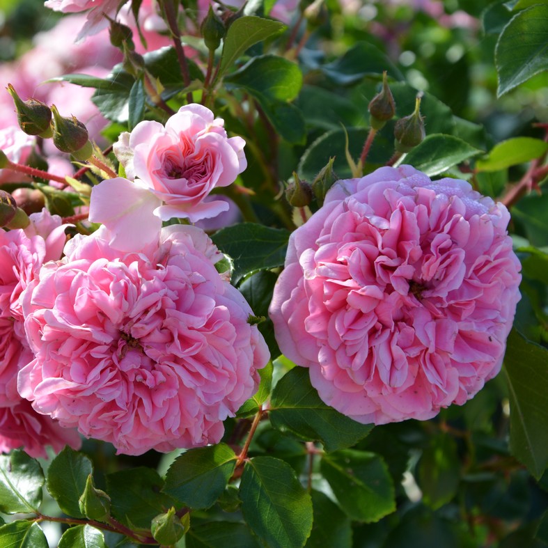 'Les Quatres Saisons' produit des petites fleurs roses très doubles. La floraison est abondante sur une longue période : de juin jusqu'à octobre. Le feuillage parfaitement sain est vert foncé et brillant.