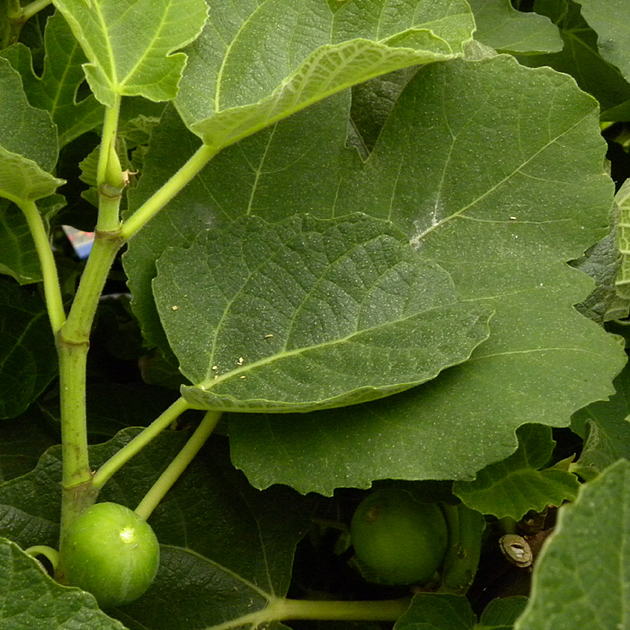 La plupart des figuiers encore vendus dans le commerce sont des sujets qui vont produire des fruits, mais qui n'atteindront jamais la maturité dans nos conditions climatiques. Le figuier est une plante originaire du bassin méditerranéen où, évidemment, les conditions climatiques sont vraiment très différentes. Par exemple, la figue de Sollies que l'on retrouve sur les étals des magasins ne fonctionne pas en Bretagne. Depuis de nombreuses années, nous avons donc fait un travail de recherche et de sélection afin de proposer une gamme de figuiers adaptés à la Bretagne, mais pas seulement ! En effet, nos figuiers donnent d'excellents résultats partout au nord de la Loire, avec une diversité de couleurs, du vert au rouge foncé, et de goûts vraiment intéressante pour les gourmands et les gourmets (nous le sommes aussi !). Parmi ceux-ci nous avons quelques obtentions anglaises dont les conditions climatiques s'apparentent aux nôtres. Les figuiers sont des arbres caducs, et mêmes des grands arbres si on ne les taille pas de la famille des moraceae, qui poussent parfaitement bien tant que la température ne descend pas en dessous de -10°C. En-dessous, la partie extérieure de la plante risque de geler mais celle-ci devrait repartir de la souche au printemps suivant. Les feuilles arrondies de 3 à 5 lobes peuvent atteindre 25 à 30 cm de largeur. La plupart des figuiers que nous cultivons ici en Bretagne sont des variétés bifères, seules les figues constituées au printemps arrivant à maturité.