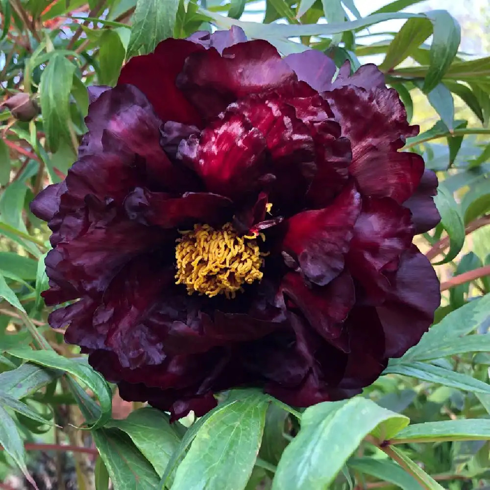 Grosses fleurs bien doubles, pourpre très sombre aux étamines jaune d'or.